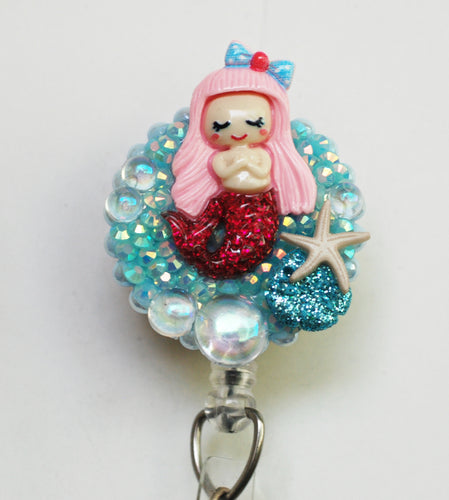 Pink Haired Mermaid Retractable ID Badge Reel