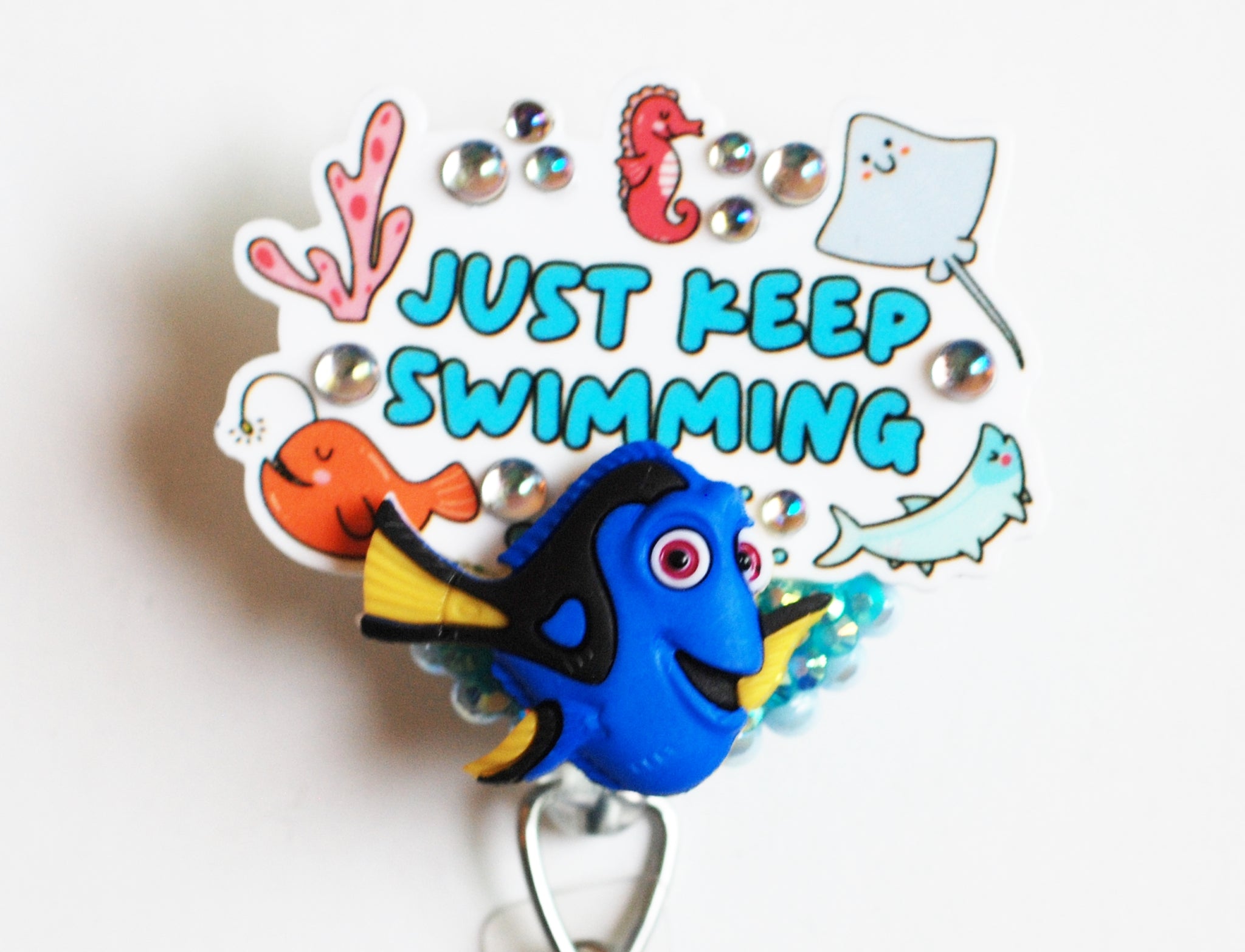 This is a planar resin piece. Sweet Dory from Finding Nemo has also been added for extra cuteness. Each flatback pearl and jelly rhinestone has been individually placed to add beauty to these pieces. A Swarovski crystal has been lovingly placed on the snap closure.