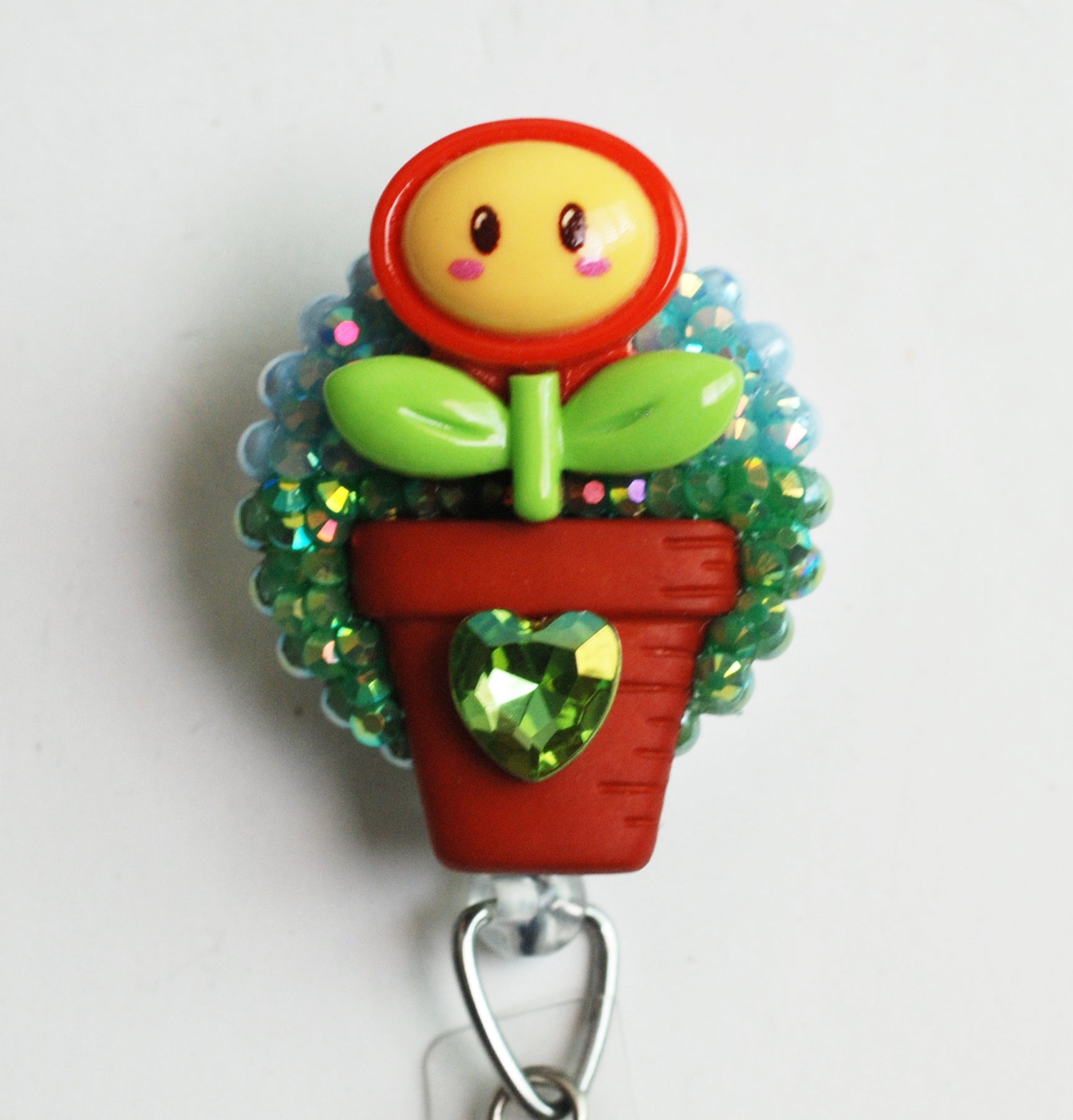 A Mario Bros Fire Flower adorns this gamer reel. It's made of resin. A shiny green heart has also been added. Each flatback pearl and jelly rhinestone has been individually placed to add beauty to these pieces. A Swarovski crystal has been lovingly placed on the snap closure.