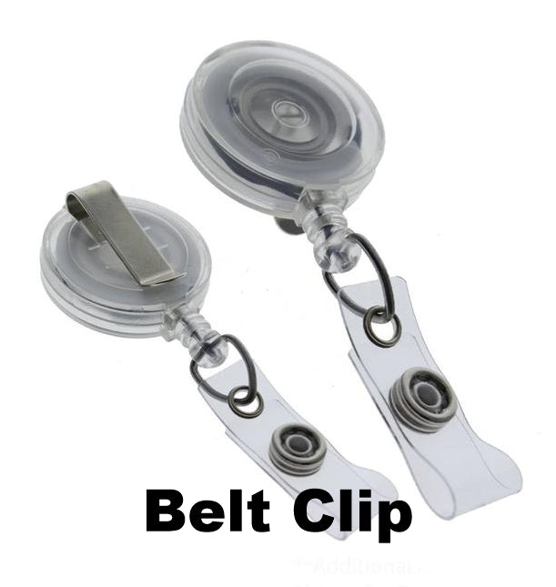 This badge reel is a clear Lucite hard case retractable backing, along with either a handy swivel alligator clip or slide/belt clip or ID Lanyard.