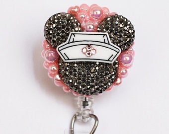 Nurse Minnie Mouse Shimmery Dark Silver On Pink Retractable ID Badge Reel