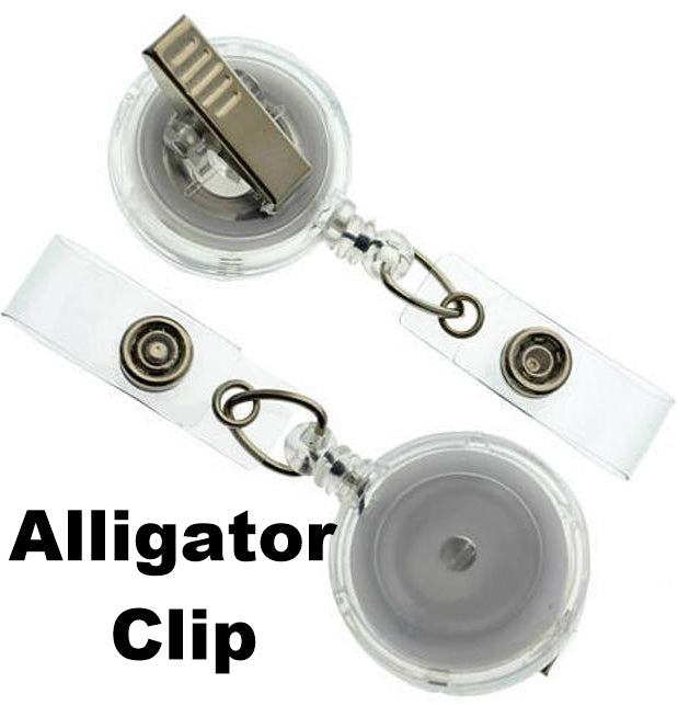 This badge reel is a clear Lucite hard case retractable backing, along with either a handy swivel alligator clip or slide/belt clip or ID Lanyard.
