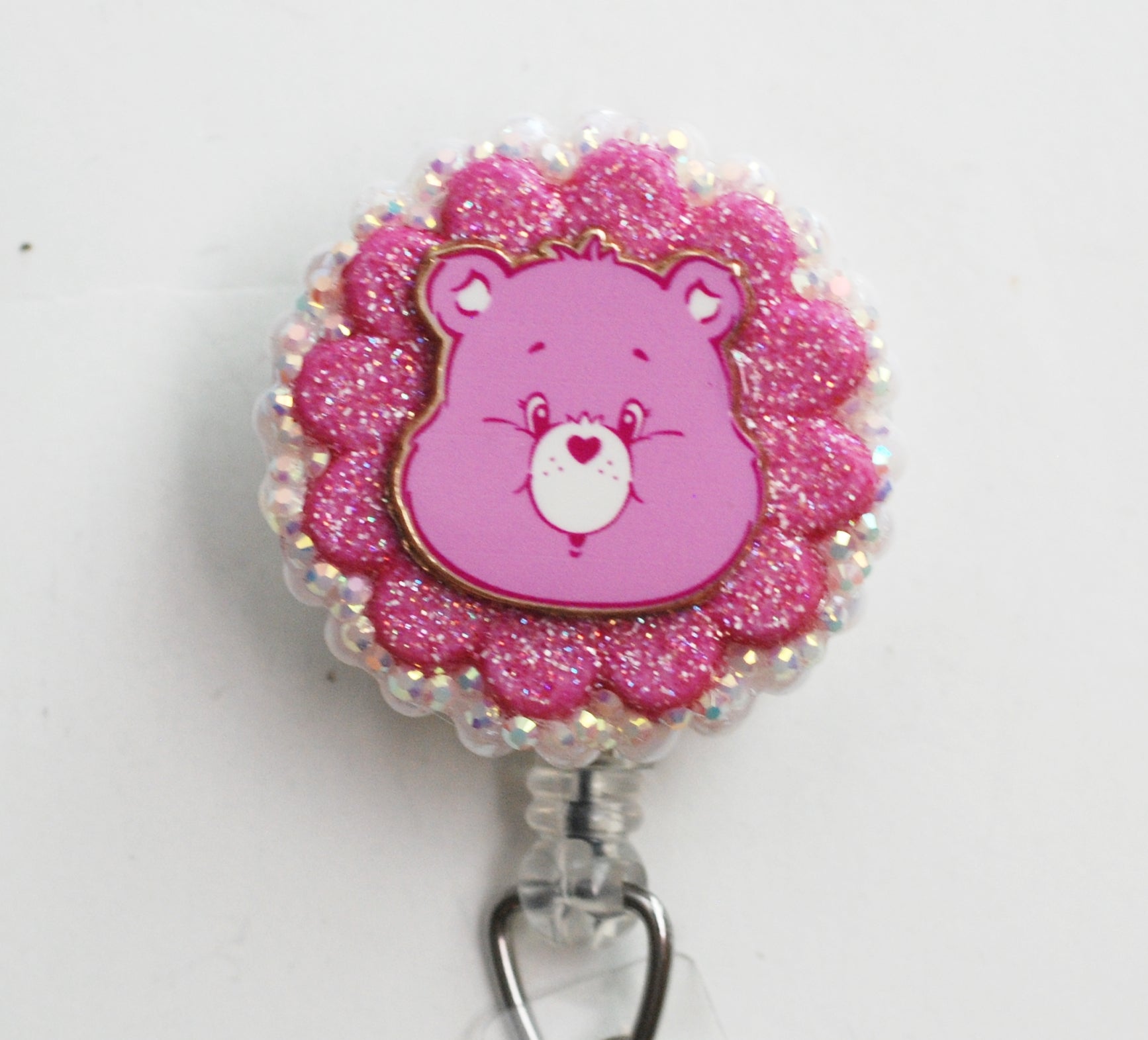 This is a gold tone metal Cheer Bear Care Bear. Each flatback pearl and jelly rhinestone has been individually placed to add beauty to these pieces. A Swarovski crystal has been lovingly placed on the snap closure.