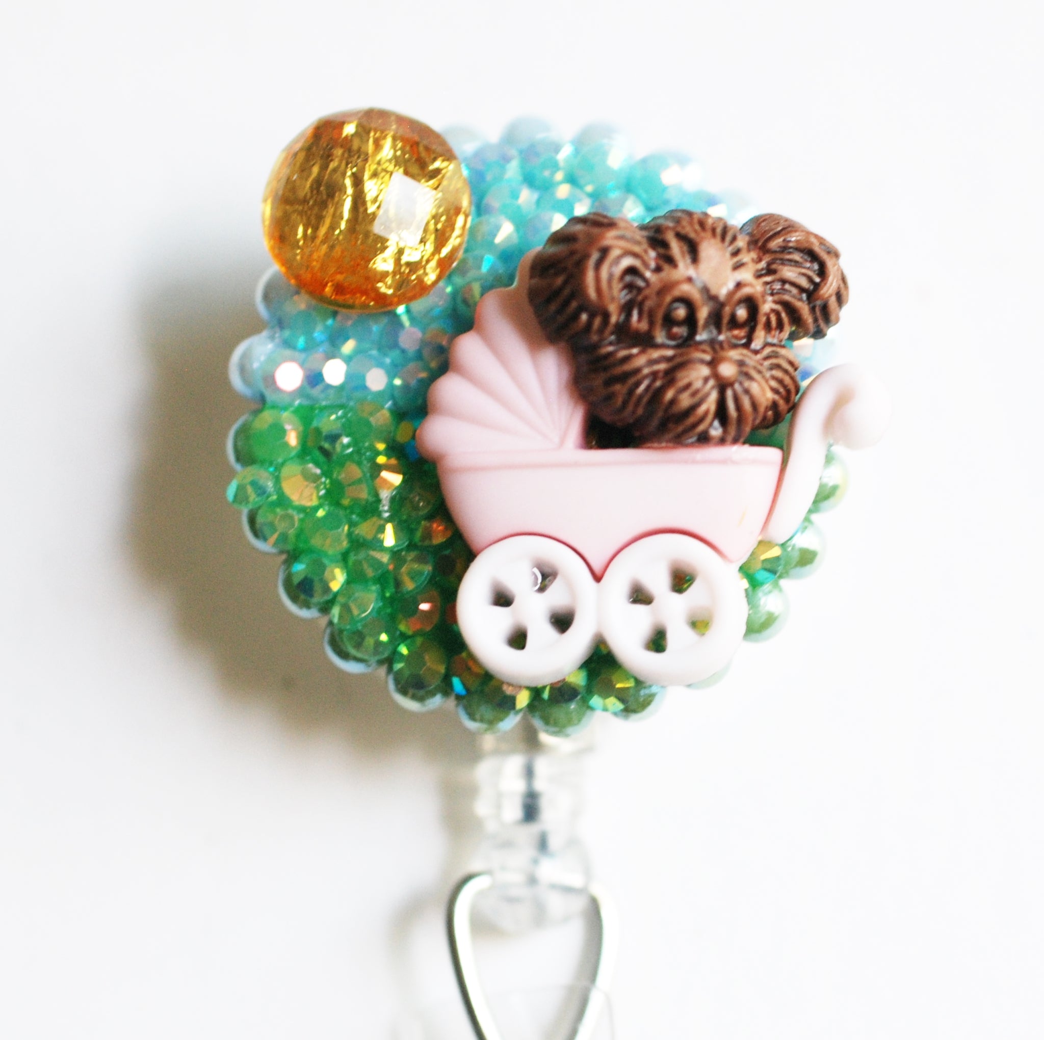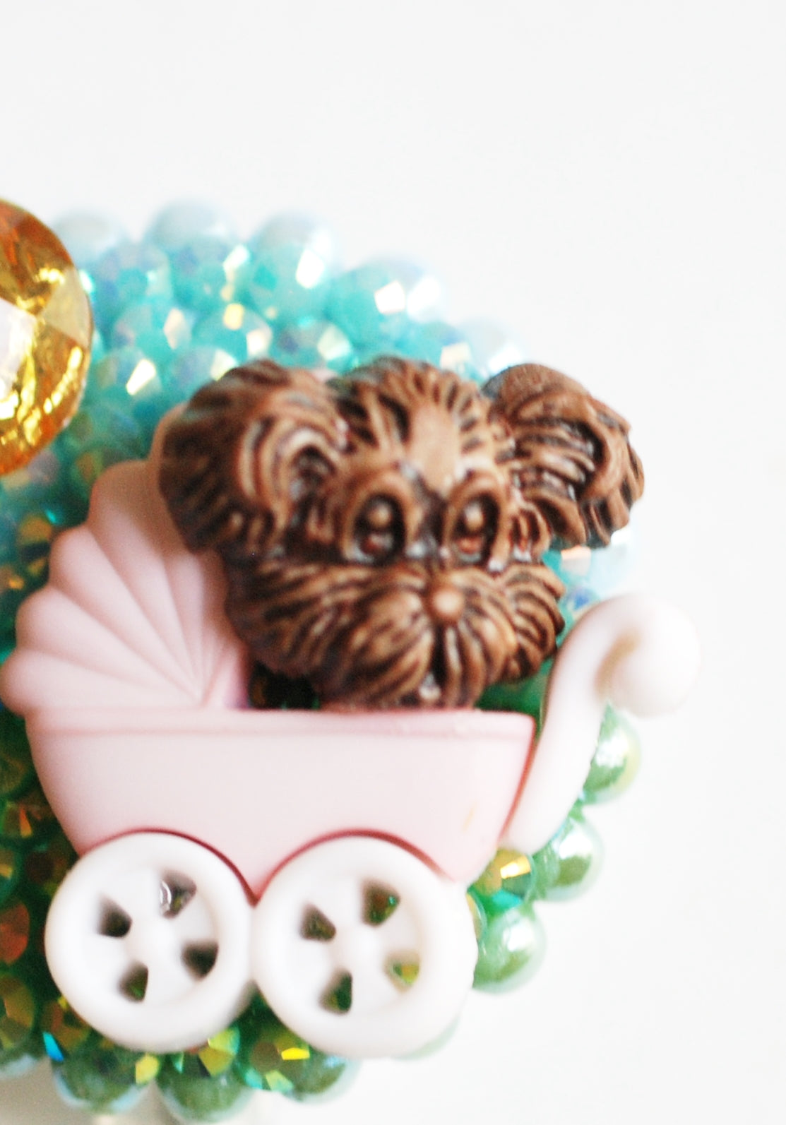 A sweet little puppy is being walked on a sunny day in her pink stroller. All pieces are made of acrylic plastic. Each flatback pearl and jelly rhinestone has been individually placed to add beauty to these pieces. A Swarovski crystal has been lovingly placed on the snap closure.