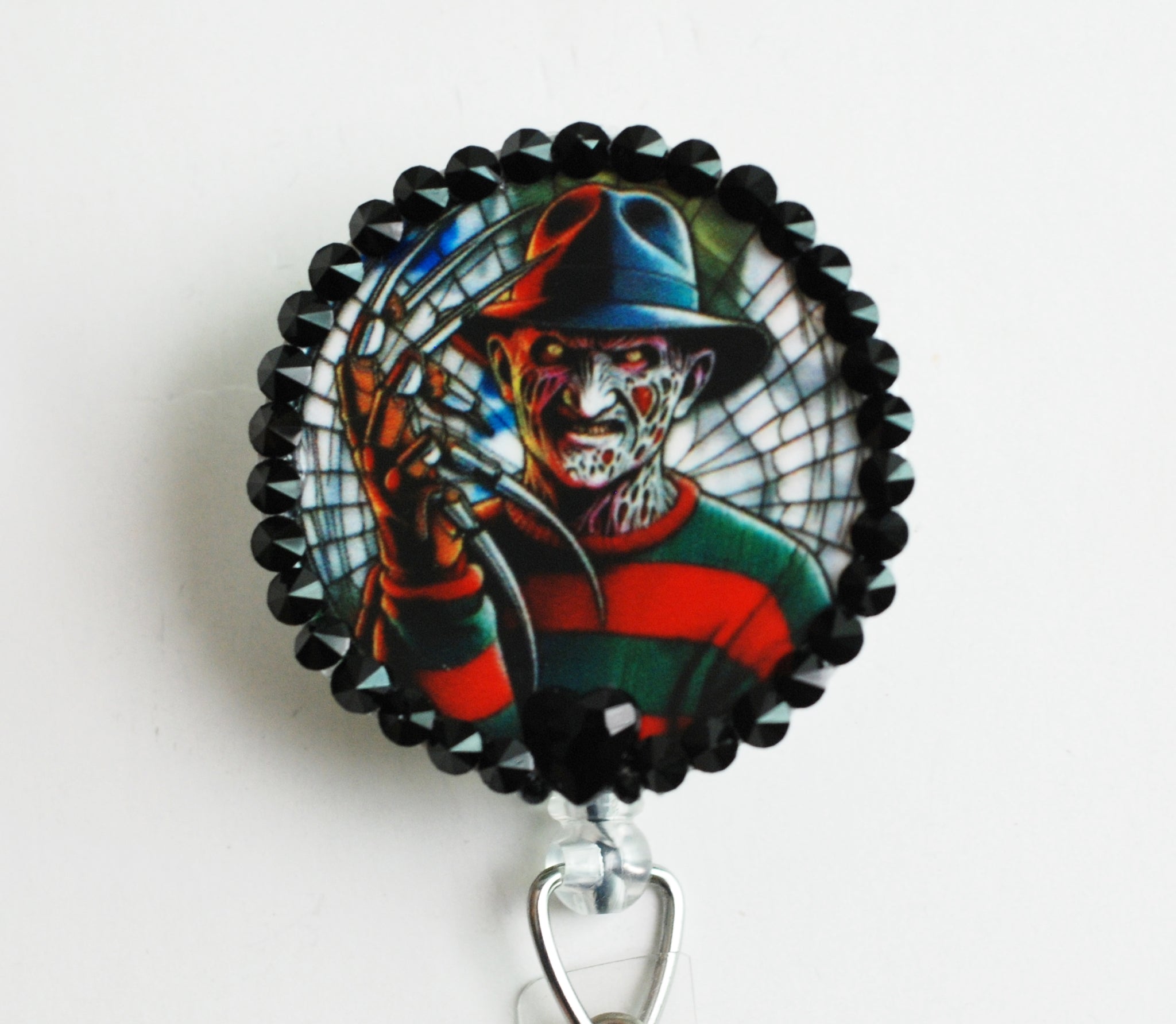 This is a planar resin piece of scary Freddy Krueger. Each flatback pearl and jelly rhinestone has been individually placed to add beauty to these pieces. A Swarovski crystal has been lovingly placed on the snap closure.